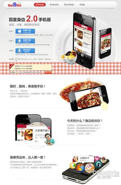 新版百度身边手机客户端支持iPhone iOS4.0、android 2.1及以上系统的智能手机,塞班的用户还需要稍等一段时间,相应的版本也将于近期上线。此次新版身边主打美食的“发现”、“分享”功能,让用户轻松畅享“美食美刻”。