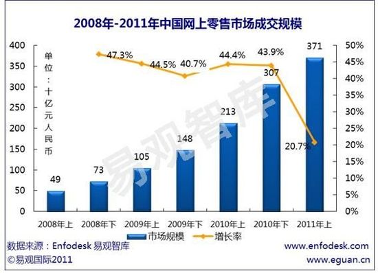据易观国际发布的《2011年第2季度中国网上零售市场季度监测》数据显示,2011年第2季度中国网上零售市场交易规模达到1924亿元,上半年累积网上零售交易额达3707亿元,同比增长74%。