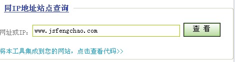 我们就以公司凤巢网络的网站www.jsfengchao.com 为例,打开网址:http://www.adminlj.com/ ,然后在同IP地址站点查询的输入框中输入网址:www.jsfengchao.com ,