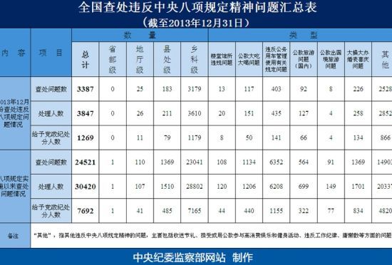 为掌握全国贯彻落实八项规定精神情况,中央纪委在31个省区市和新疆生产建设兵团、60个中央和国家机关建立了落实中央八项规定精神情况月报制度。截至2013年12月31日,全国查处违反中央八项规定精神问题情况如上表! |
