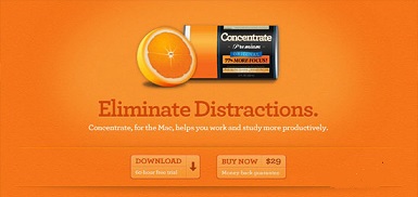 以Concentrate 网站为例,它看起来很适合我们初次集中精力来欣赏。从一个高层次的视角开始,我们可以看到Concentrate网站的使用了一个富有创意视觉技巧。除了这罐橙汁,我们看到一个橙色为主题的调色板和背景,很好的模拟了真实的橙子的果肉口感。进一步研究,我们发现它使用了CSS3为文本增加一些阴影来增加与背景的对比。为了真正的欣赏细节,我们需要在进一步的研究。