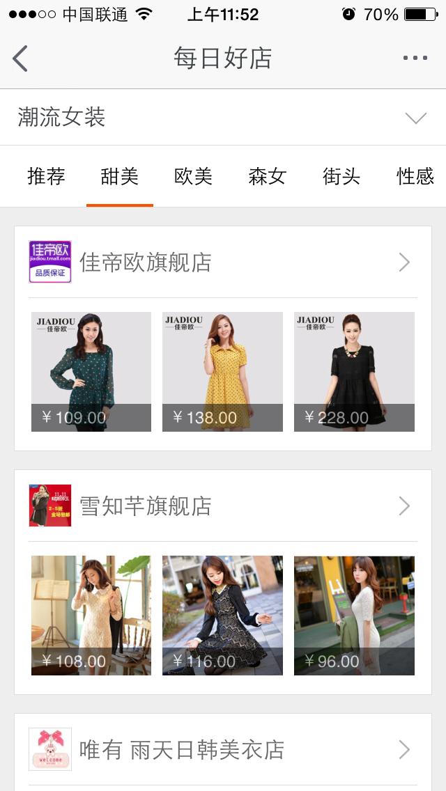 2、每日好店以单个店铺展现改为以主题市场方式展现,点击进入相应主题页面,再以店铺形式展现,如下图所示: