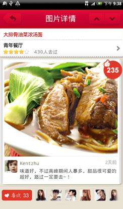 除了注重用户对美食的分享及个性化需求的满足,新版百度身边还提供了对美食信息的投票、评论功能,让用户在分享美食的同时也能进行点评,根据分享和点评的内容用户还将获得各类美食徽章,成为每个达人的身份象征。对于新浪微博用户,更是可以直接通过微博帐号登录百度身边,并且能够随时将美食分享到新浪微博来诱惑更多好友。而独特的图像压缩技术,更可为用户极大节省流量,放心享受每一次移动美食之旅。达人们还等什么,快来一起将美食进行到底吧! |