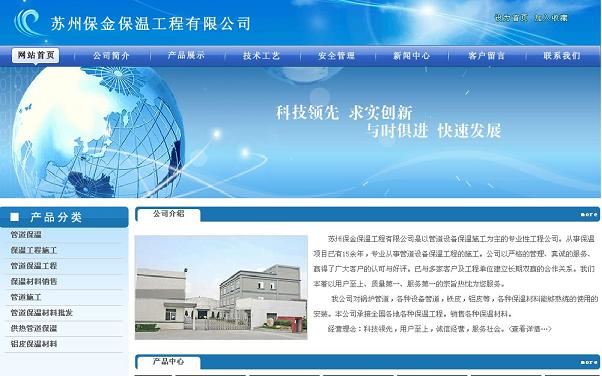 苏州保金保温工程有限公司是以管道设备保温施工为主的专业性工程公司。从事保温项目已有15余年,专业从事管道设备保温工程的施工。公司以严格的管理、真诚的服务、赢得了广大客户的认可与好评。已与多家客户及工程单位建立长期双赢的合作关系。我们本着以用户至上、质量第一、服务第一的宗旨热忱为您服务。 我公司对锅炉管道,各种设备管道,铁皮,铝皮等,各种保温材料能够熟练的使用的安装。本公司承接全国各地各种保温工程。销售各种保温材料。 经营理念:科技领先,用户至上,诚信经营,服务社会。 经营方针:诚实守信,是我们的准则;产品质量,是我们的生命;高效服务,是我们的承诺;客户满意是我们的追求! 公司主营::江苏管道保温;上海管道保温,浙江管道保温;苏州保温施工;苏州保温工程