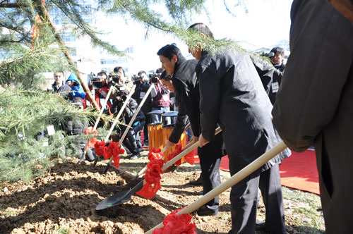 在现场可以看到,一个巨大的幕布从大厦西侧的顶楼垂下,上面印着百度数千名员工照片组成的笑脸,使过往的行人都感受到庆典仪式的喜庆氛围。仪式上,300名百度员工及百度爱好者们共同出演“百人秀”,通过跑动在大厦前的广场上排出一个个活泼生动的庆典图案,更将整个活动的气氛推向高潮。最后,李彦宏和员工及网友代表一起,在大厦前种下一棵象征基业长青的雪松,培上百度各地网友取来的五岳之土,并以长江、黄河之水浇灌。