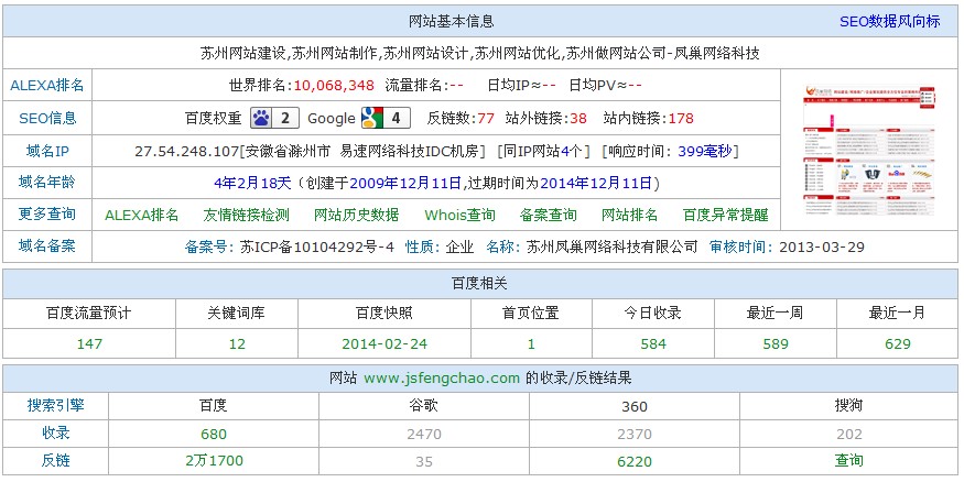 整体来说,网站针对广泛性的优化所获得的流量会更多,从而转化率会更好。但目前很多企业,特别是网站建设企业仍然将目光放在区域性优化上,白白错失了发展的好时机。2014年,是该改变的时候了! 实际上,区域性优化与广泛性优化并不相悖,我们在进行区域性优化的同时也可以进行广泛性优化,就譬如我们同一个网站既可以优化“”这个关键词,同时也可以优化“网站建设”关键词一样。至于排名如何,就要看优化的效果了。广州网站优化小编并非要讨论这两者之间的关系,仅仅是分析一下,这两种优化方式,在效果上有什么区别。以我们凤巢网络的网站为例。网站的关键词为“”,“”,排名如下: