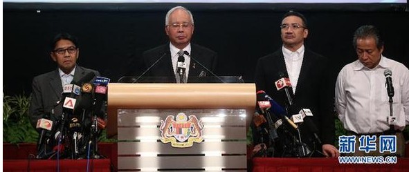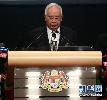 3月24日,在马来西亚吉隆坡,马来西亚总理纳吉布就马航失联航班举行记者会。马来西亚总理纳吉布当日宣布,根据对所有信息的分析,调查人员认为失联的马航MH370航班的最后位置在南印度洋,位于珀斯以西,此处没有任何可着陆之处。新华社记者王申摄