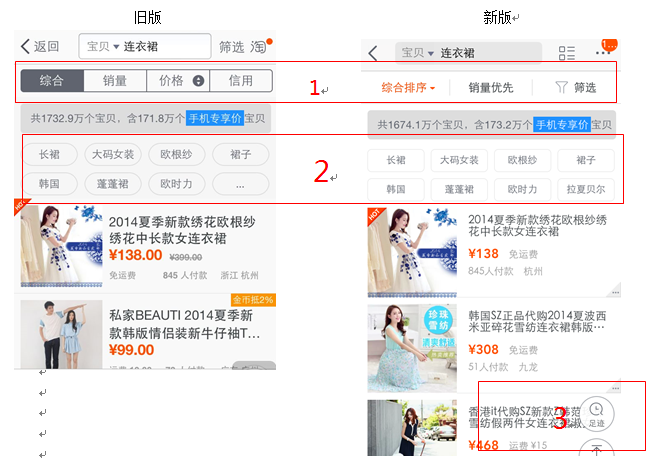 1、“价格”与“信用”排序被集成到”综合“的下面,“筛选”下移至与排序同一行。