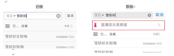 2、搜索框下拉热词,在搜索一些大类目关键词时,会出现相应频道入口,点击后会进入类似于PC上“主题市场”的页面。第一屏会有跳转至二级类目的入口。