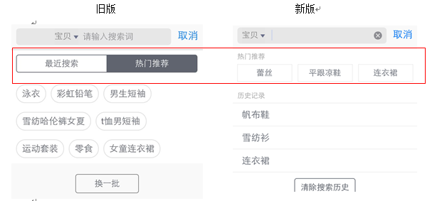1、搜索框默认状态将“最近搜索”和“热门推荐”合并了,推荐的关键词减少了。