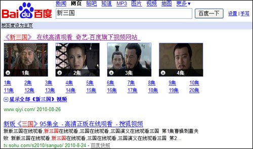 以今年热播剧《新三国》为例,细心的网友可能会注意到,如今只要在百度输入“新三国”就可以找到详细视频结果,其中还包括全部的剧集,提供这些内容的当然只有百度旗下的视频网站奇艺。