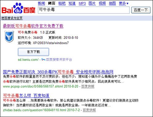 百度搜索结构直接出现可牛杀毒的下载链接(腾讯科技配图)