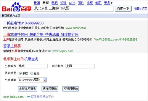 细心的网友可能已经注意到,当在百度输入“从北京到上海的飞机票”时,会出来一个“从北京到上海的机票查询”窗口,并且下面提供了去哪儿、携程、同城网三种查询方式。
