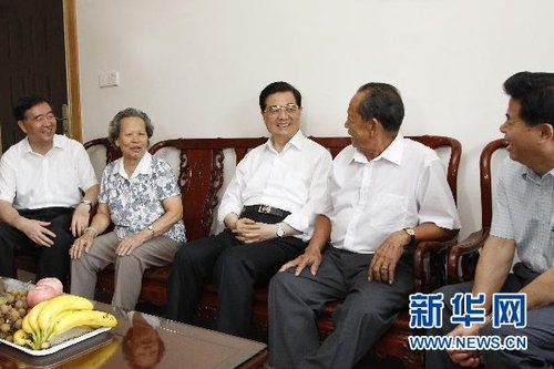 9月4日至6日,中共中央总书记、国家主席、中央军委主席胡锦涛在广东深圳考察工作。这是胡锦涛来到罗湖区南湖街道渔民村社区居民吴锦清老人家中,同一家人亲切拉家常。新华社记者李学仁摄