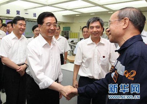 9月4日至6日,中共中央总书记、国家主席、中央军委主席胡锦涛在广东深圳考察工作。这是胡锦涛考察中国广东核电集团有限公司大亚湾核电基地时,同核电专家和企业员工亲切交谈,了解核电站建设和运营情况。新华社记者鞠鹏摄