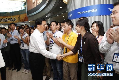 9月4日至6日,中共中央总书记、国家主席、中央军委主席胡锦涛在广东深圳考察工作。这是胡锦涛在腾讯计算机系统有限公司殷切勉励年轻员工,充分发挥聪明才智,坚持自主创新,为壮大民族互联网产业贡献力量。新华社记者李学仁摄