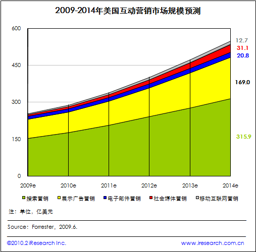 iResearch艾瑞咨询整理Forrester的数据发现, 2014年搜索营销市场规模将达315.9亿美元。数据显示,2009年美国搜索营销市场规模达153.9亿美元,遥遥领先于其他互动营销方式,预计2014年将突破300亿美元,届时在美国整个互动营销市场规模中占57.5%;且连续六年均保持高增长态势,年复合增长率为15%.另外数据还显示,展示广告营销市场规模次之,电子邮件、移动互联网、社会媒体营销如博客营销等市场规模均较小。 |